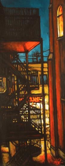 His figurative approach, based on a blend of sketches and work from memory, aims mainly to depict the urban environment as he perceives itthrough its landscapes and architecture, as well as the human and animal societies that inhabit it. In this way, through form and color, the artist creates emotive and expressive atmospheres.
